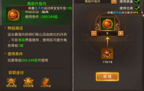 只能用于(200-249级升级使用)也可以升级丹碎片合成,需要18个碎片。