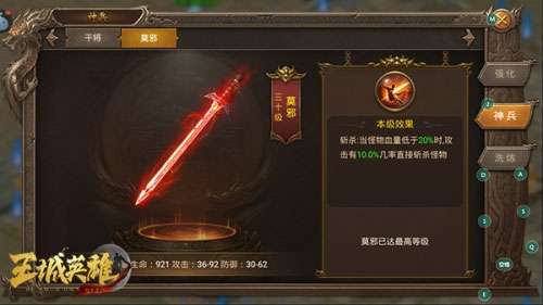 9、然后就是神兵系统(干将满级100级,莫邪满级30级)。前期有个神兵竞技,先搞干将的等级,提升需要的绑定元宝少一些,活动做完再搞莫邪,因为莫邪带的斩杀技能太强悍,而且vip boss也需要莫邪的斩杀属性,来快速通关领先其他人。