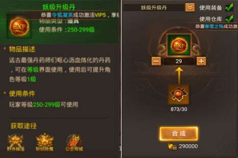只能用于(250-299级升级使用)也可以升级丹碎片合成,需要30个碎片。
