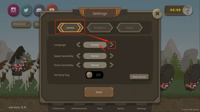 3、跳转页面后,首先点击【Game】,其次点击【>】,直到看见Chinese这个英文出现,就代表已经切换了中文,最后点击【save】保存