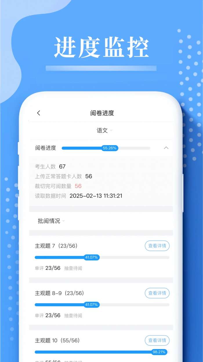 2、实时记录教师的阅卷进度,同时可以查看整体评阅进度,支持复查。