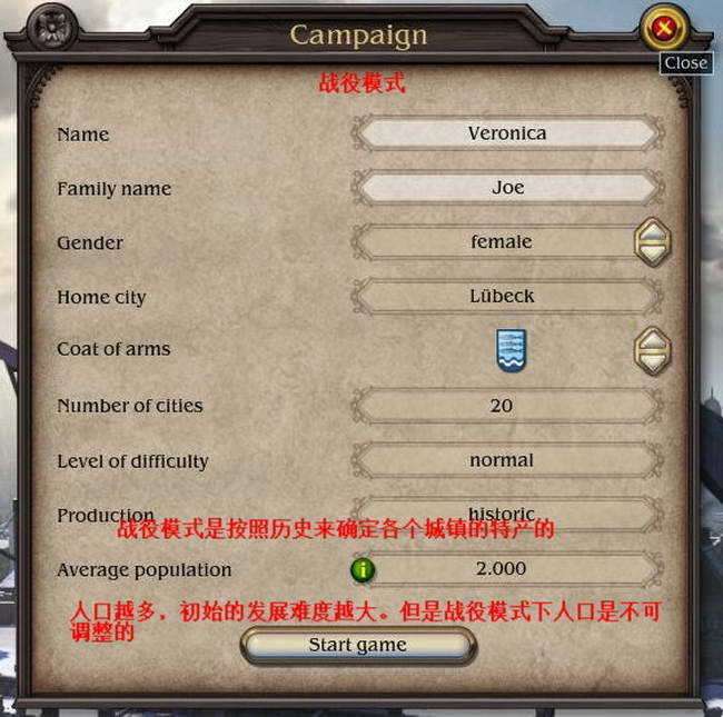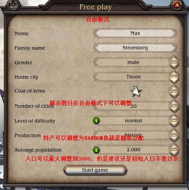这里的PRODUCTION HISTORIC意思就是按照历史的真实模式来定义各个城镇的特产。而人口数字也是不可调整的。如果你是第一次接触此游戏的话,建议从战役模式开始入手