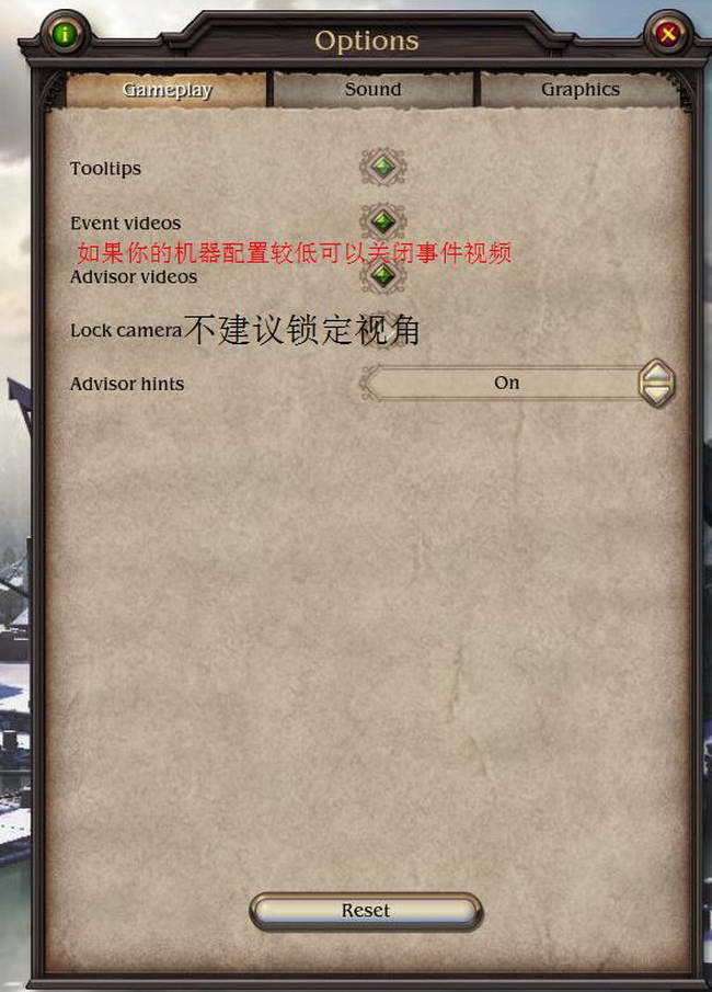 游戏的选项没有什么多余要进行说明的。锁定视角选项不建议开启。如果你的机器配置不是很好的话,可以关闭EVENT VIDEOS 和ADVISOR VIDEOS