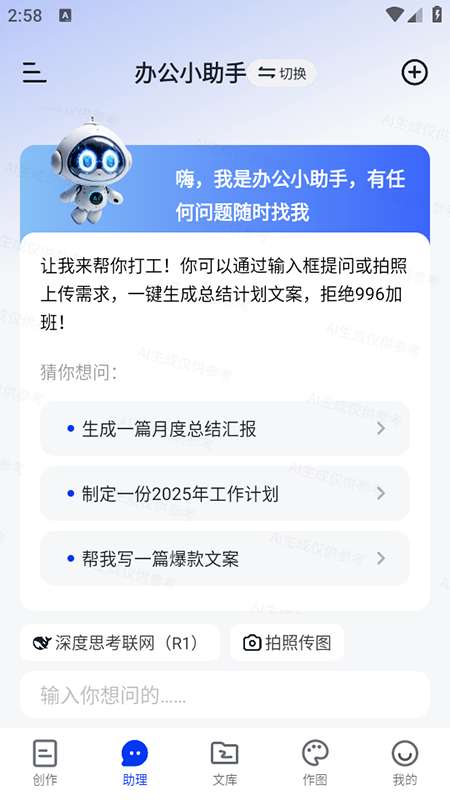 3、智能助手:通过上传需求,实现智能对话,一键生成总结方案副本,减少无效加班,提高工作效率。