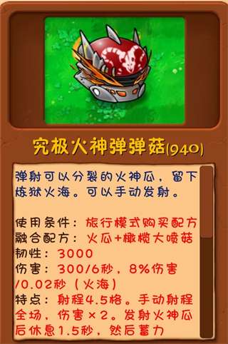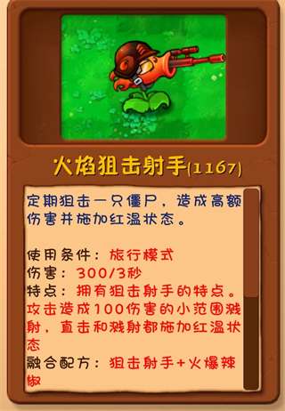 核心能力:每3秒对单个僵尸造成300点伤害,同时附带100点小范围溅射伤害,直击和溅射都能施加“红温”状态。