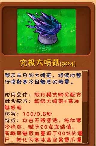核心能力:对整行持续喷射冰冷且魅惑的烟雾,每0.5秒造成100点穿透伤害,施加20点冻结值,并有概率魅惑血量低于40%的僵尸,将其转化为寒冰高坚果雪爪僵尸。