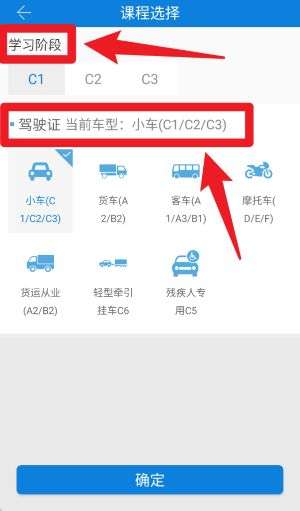 2、在课程选择界面,学员可根据学习阶段选择相应车型,如小车C1/C2/C3或货车、客车等,点击确认进入课程。