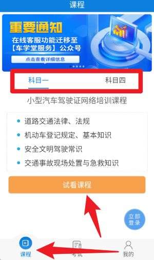 3、课程页面提供科目一与科目四培训内容,涵盖交通法规、登记规定、安全驾驶与事故处理知识,用户可点击“试看课程”。