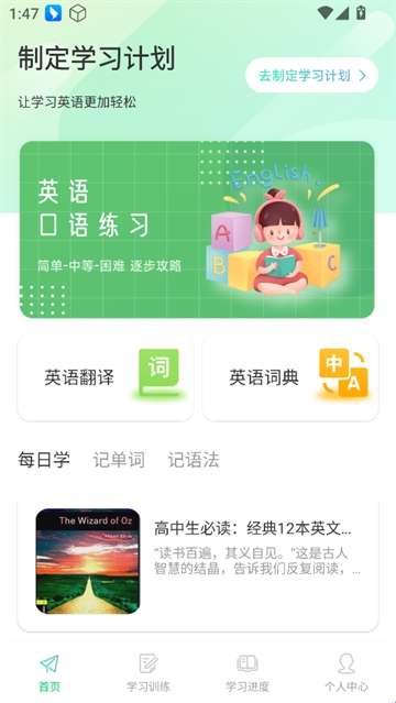 2、首页可进行英语口语学习,还有英语翻译、英语词典等功能。