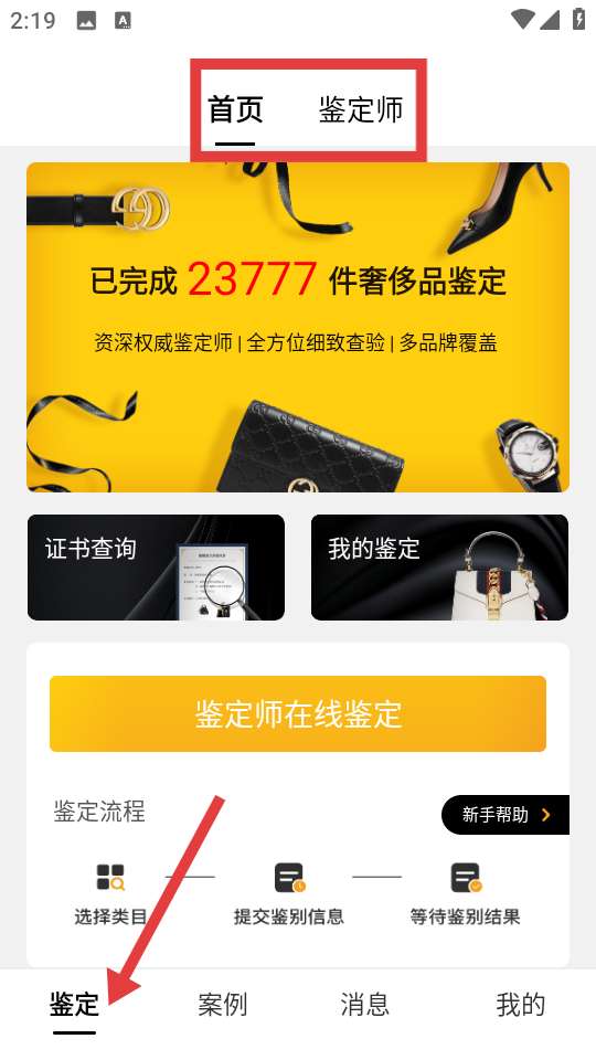 2、APP的鉴定页面顶部有首页、鉴定师标签,可切换不同功能区,底部鉴定、案例等导航,串联各业务板块助力用户完成奢侈品鉴定与相关服务。