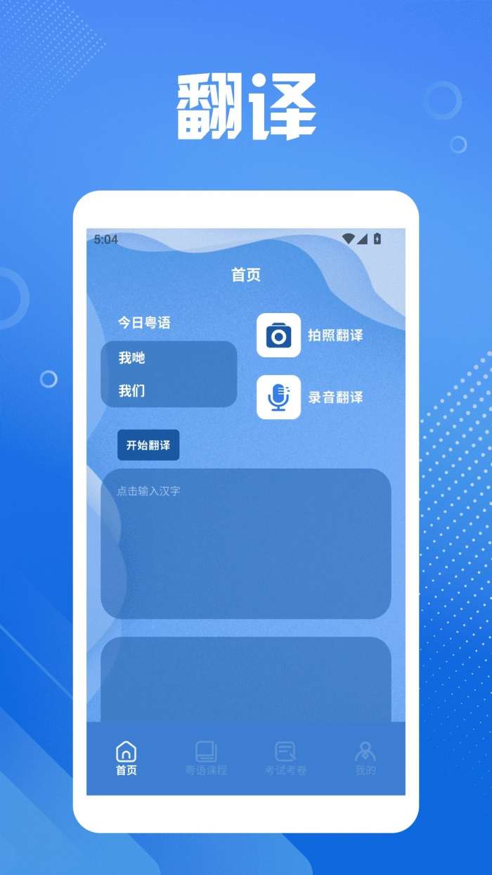 2、进入到软件首页,如图所示,这里 提供了今日粤语推荐,拍照翻译,录音翻译,文字翻译等功能。