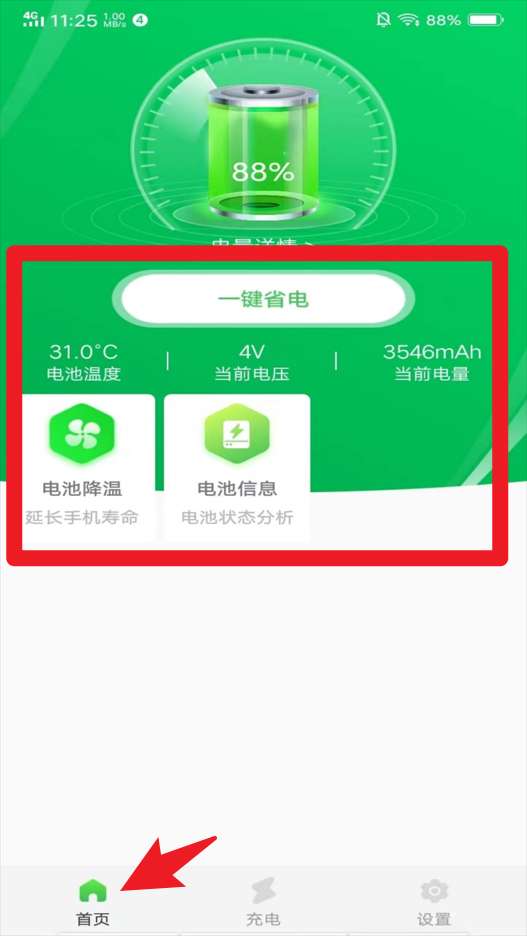 2、在电池管理页面,可以查看电池温度、电压和当前电量,同时通过“一键省电”功能实现快速优化,降低电池消耗。