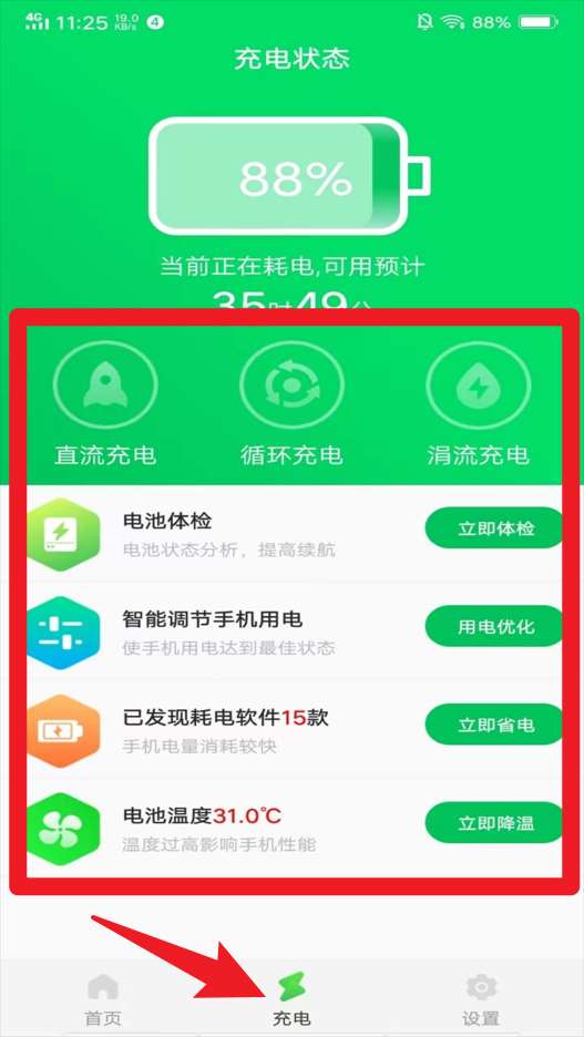 3、切换到充电页面,可以选择直流充电、循环充电或滑流充电模式,并查看电池体检、耗电软件分析和降温等功能,确保充电更科学安全。