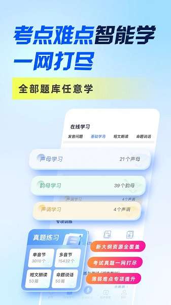 5、专项训练:精心为您准备普通话考试发音难点和易混淆点对比训练,常见难关一一破解。