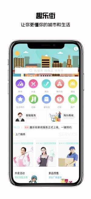 2.找服务快上趣乐街,家政服务,汽车维修,在线注册,房地产中介,一键预约;