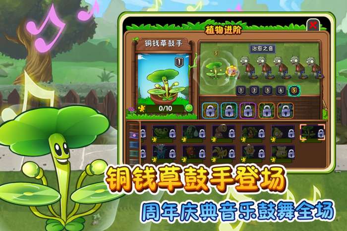 灯光!奏乐!鼓声!舞台的幕布已经拉开,七周年庆典专属植物铜钱草鼓手登场啦!铜钱草鼓手可以击鼓发出音波,美妙的乐音不仅会对附近的植物造成激励效果,带来攻击力和攻速的全方面加持,还能吸引僵尸驻足,造成减速效果。如果周围有音乐植物的伙伴们,它们的合奏将会更加精彩,敬请期待他的精彩表现吧!