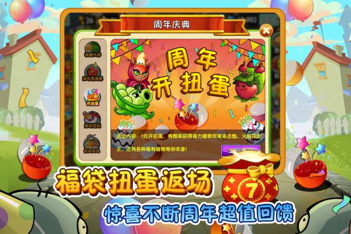 僵尸博士回来了!僵博竞速赛再启,在三轮挑战中前往不同的时空,击败博士的机甲将会掉落周年水晶,可在限时转盘中抽取海量奖励,七周年庆典专属植物铜钱草鼓手也在其中哦!
