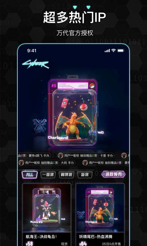 赛博赏是潮玩手办抽盒平台 一发入魂多款万代正版盲盒手办等你来抽!各种超火爆、超经典的动漫系列在赛博赏都能找到。赛博赏让您在线拆盒、超速发货到家,每周新品全年不停。新人注册立即送188元大礼包,潮流好物立刻带走,每日更新!社群红包永不停!随时随地拆盲盒,赛博朋克风格沉浸式开盒体验,天天新品上线!感兴趣的朋友不要错过下载赛博赏。