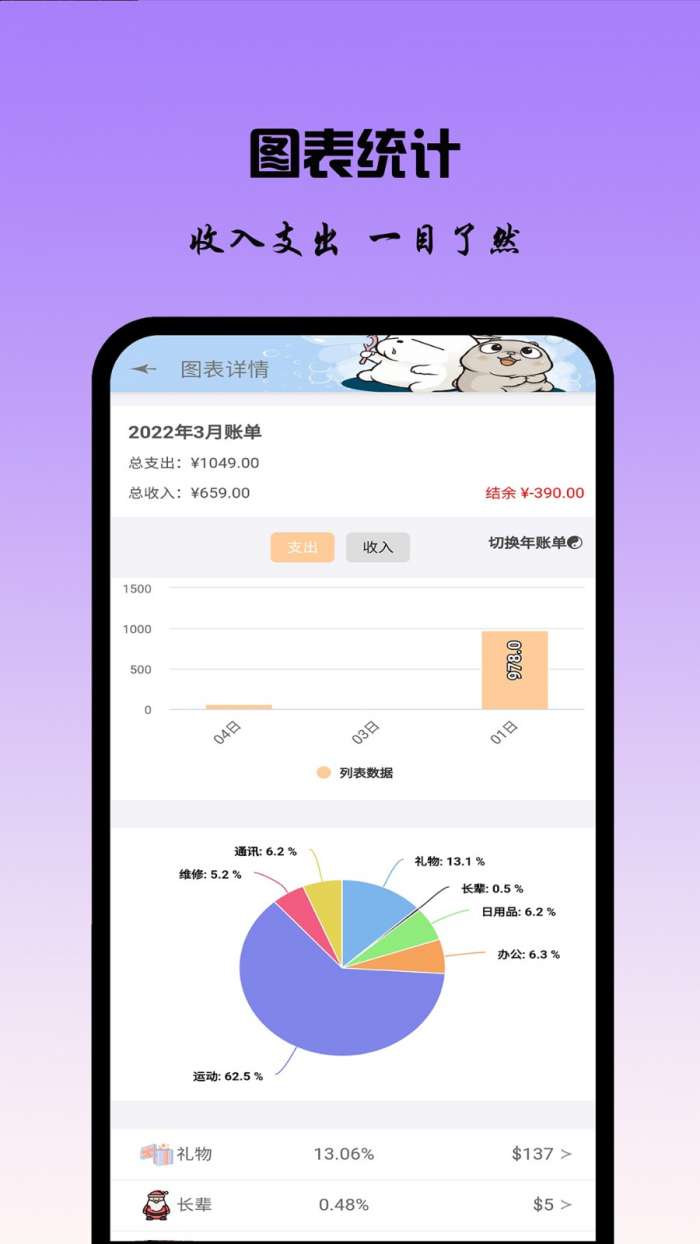 2、「统计分析」图表形式的数据分析,收入支出分析一目了然。