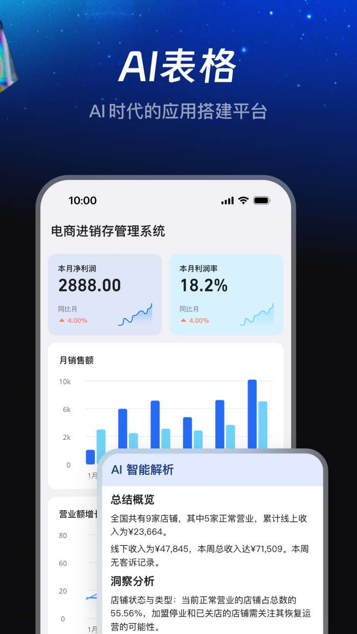 【AI 表格】:让每个人成为 AI 应用“创造者”,无需开发,像做表格一样,轻松搭建业务系统。丰富的 500 强企业同款模板,开箱即用,客户管理、门店管理、经营分析、招聘管理等业务系统轻松上手,会用表格就会搭。