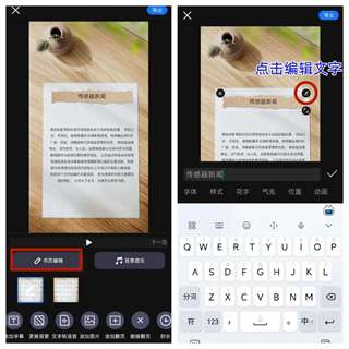3、点击“书页编辑”,删除原文本,调整好文本框的样式和位置,再把我们准备好的文字内容输入。或者直接在屏幕上点击文本框,点击右上角编辑工具。文本字数太多的话,可以使用“添加翻页”功能。