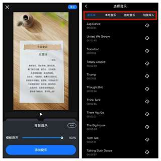 4、点击“背景音乐”,可以直接使用模板原声,也可以添加配乐。软件支持音乐库、本地音乐、提取音乐、链接导入四种配乐方式。最后导出保存即可。