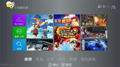 2、打开小鸡模拟器,进入主界面,在画面下方共分有6个项目,分别是【推荐】、【专题】、【分类】、【对战】、【管理】、【我的游戏】,可以通过电视的遥控器与小鸡手柄实现页面之间的切换。
