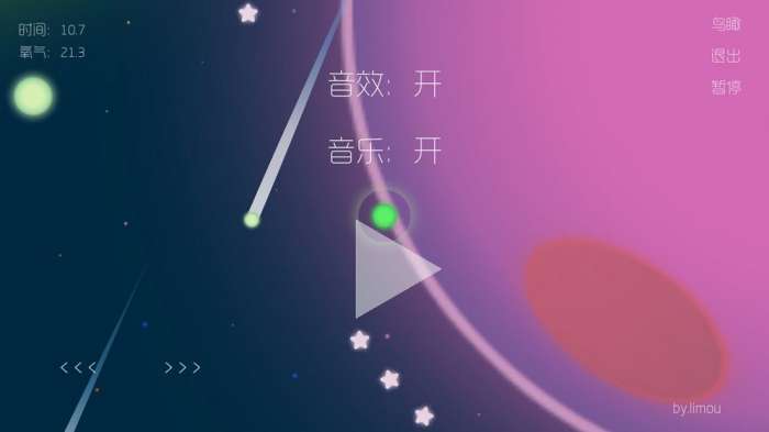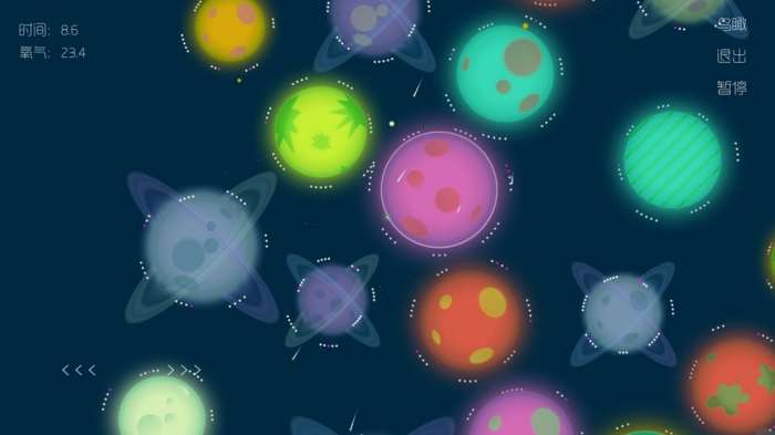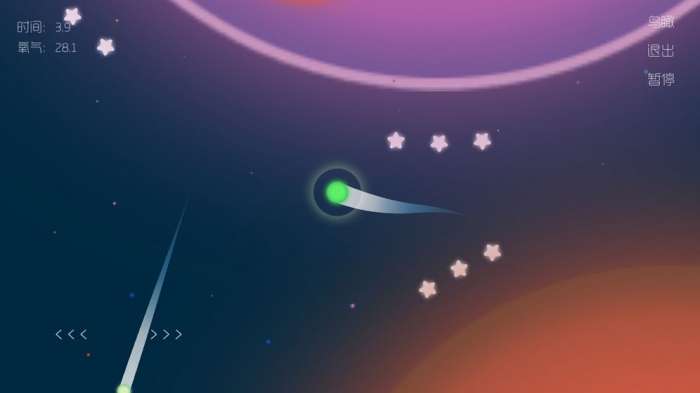 予游戏在这里拥有不同的星球,需要做的就是控制自己的圆球物体开始收集星星的旅行。予的控制方式就是点击或者是长按控制它的移动,在移动时候可以看到在不同的星球的外围有不同数量的星星可以收集起来。但是要注意周边的情况,看清还剩余多少的氧气可以提供给予,还能够坚持多久的时间。在游戏中玩家们是可以选择开启音效还有背景音乐或者关闭。