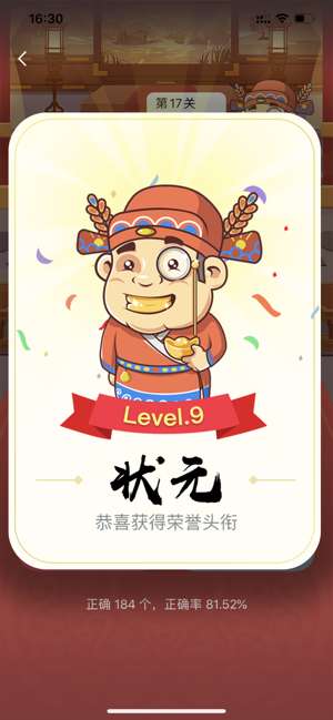 1、游戏中设有等级划分,最开始玩家的等级为乞丐,你需要不断的答题提升自己的等级最后成为状元。