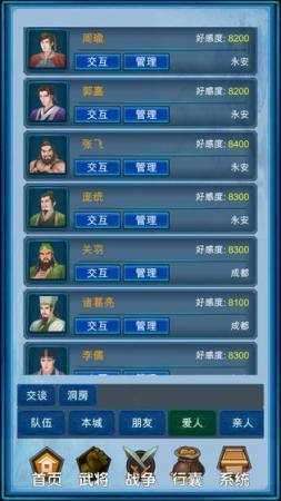 1、大量的文臣武将自由的互动来提升好感度,好感度到达一定的数量即可招募。