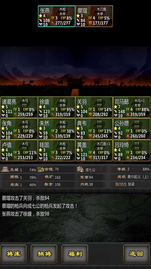 6.开始游戏,一上去可以把将都放上去,优先魅力高的,你会发现打不过(为什么对面有装备我没有,小萌新又会问怎么造装备),造装备要金钱加铁,金钱只能打赢对方后卖对方装备得到,所以先挂着挨打等级上去了打的过了有钱造装备就好起来了(这里注意每个战役图一开始都是先花粮食打boss战,打赢了会自动跳到下一个战役图,你可以自己手动调回之前的战役图,已经打过的就只会打遭遇战了不会再出现花粮食打boss战,这时你可以选择把一些武将下了,专门练一些魅力高的武将和做他们的装备),然后地图能往后推就往后退(直到兖州,这个不要碰,打过了就会出击退,前面打不过不要开,氪佬请无视),在推图中还会发现对面装备比较高级,自己装备一直这么垃圾怎么升级又是一个问题(这里要看炼铁等级每10级提升品质,炼铁0级都是木装备,炼铁10就有铁装备了,炼铁20级就有铜装备………炼铁等级怎么提升的快,这就跟主城等级一样看上阵武将的政这个属性)。