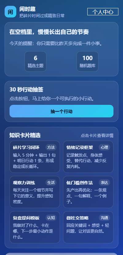 闲时趣是一款专为碎片化时光打造的轻量成长应用。以 “把碎片时间过成精致日常” 为核心,通过知识卡片、行动引导与互动练习,以温柔松弛的陪伴感,为用户打造了适配碎片化时光的轻量成长体系。不追求速成与高强度,只希望陪你在日常的空隙里,通过一个个小行动、一次次轻学习,慢慢搭建属于自己的成长节奏。让每一段看似无用的闲暇,都变成滋养生活与自我的养分,在松弛中慢慢成为更好的自己。