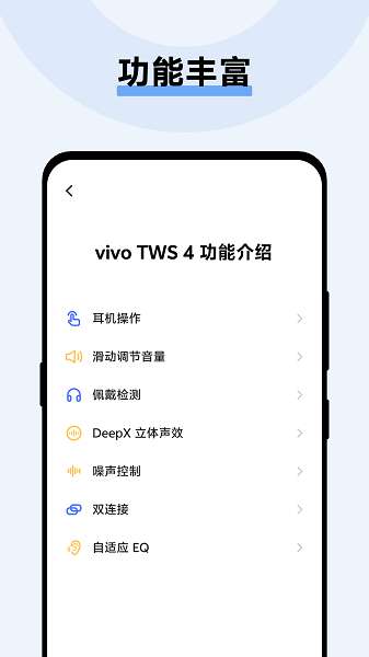 vivo耳机是一款用于vivo耳机固件升级及管理的服务软件,应用具备智能音质调节功能,可以根据用户的听觉偏好和音乐类型,实时调整音质,提供更加清晰、逼真的音乐体验。用户可以通过该应用自定义耳机的按键功能、音效模式和均衡器设置,以满足个人对音乐的特定需求,实现个性化的听觉体验。应用支持环境音模式,可以在耳机佩戴时通过麦克风传递周围环境的声音,保持用户对周围环境的感知,提升安全性。