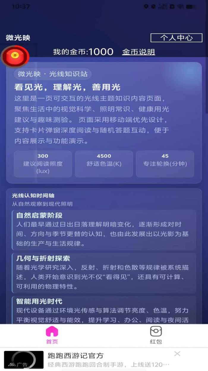 微光映是一款专注于光知识和视觉健康的互动学习应用,专为想要科学保护眼睛、改善用眼环境的人设计。它带你从自然观察到智能用光,逐渐了解光和眼睛的关系。无论你是想了解不同照明条件对视力的影响,学习优化阅读角度和夜间用眼的实用技术,还是想通过有趣的互动问答测试你对照明的了解,它都能为你提供丰富的内容和周到的指导。在这里,我们通过一条时间线来组织人类对光的认知过程,并辅以专门的知识卡片、护眼技巧分享、互动随机提问等,让你可以学习如何科学地管理照明环境,看到、理解、利用好光,让你的眼睛的每一次使用都更加舒适和健康,是你保护视力健康的亲密伙伴。