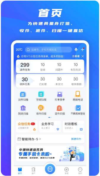 3、扫描、打印、录单、实名寄递、收款、签收、问题件登记等日常工作的必备工具。