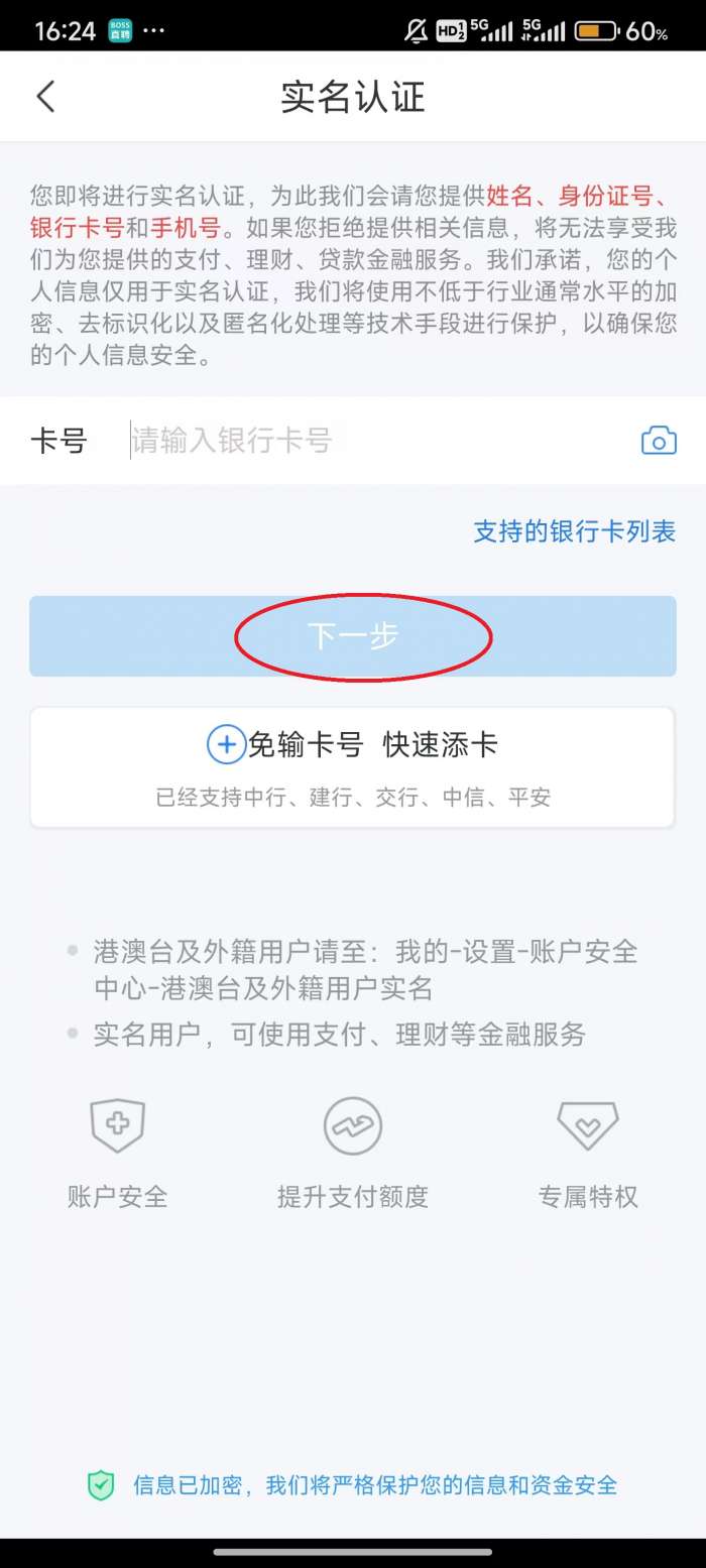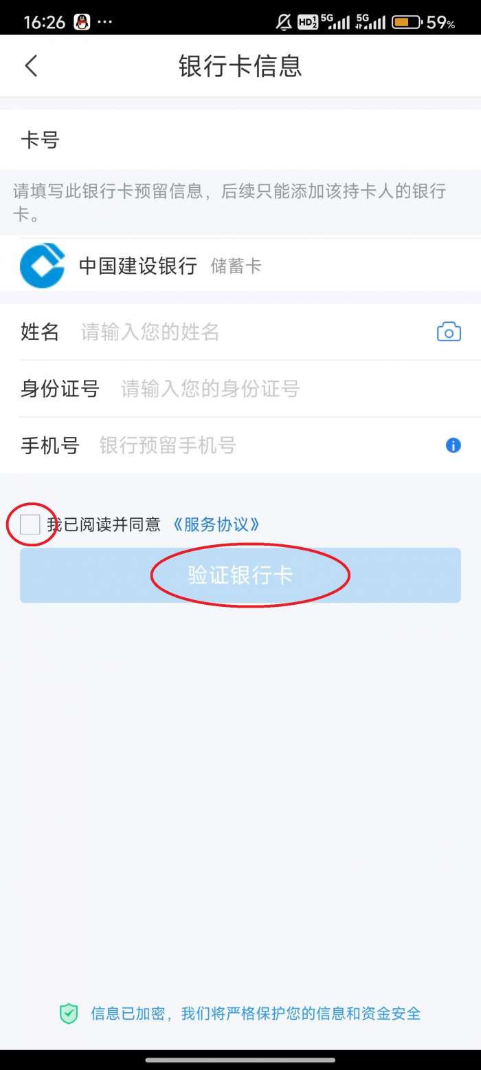 6、输入相关信息,点击“我已阅读并同意...”,随后点击“验证银行卡”。