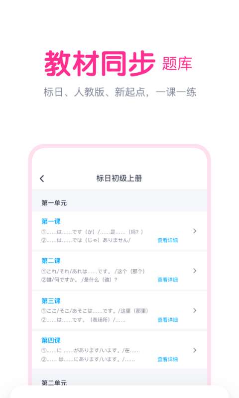 2、全阶段课程体系:涵盖从N5到N1的所有级别的内容,从平假名到高级语法系统。