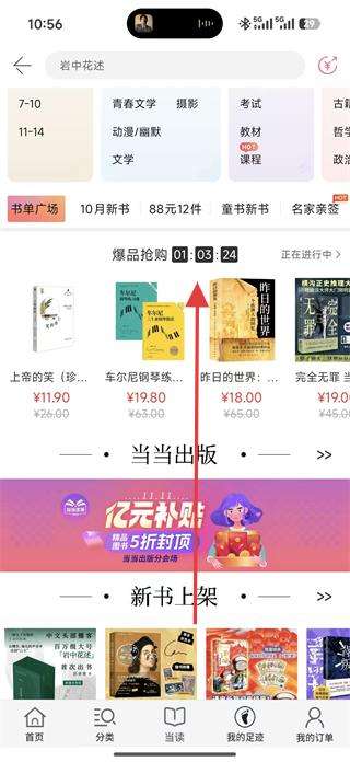 2、切换到分类页面查看爆品抢购板块了解上帝的笑、车尔尼钢琴练等爆品书籍的价格与抢购时间,参与书籍的抢购活动。