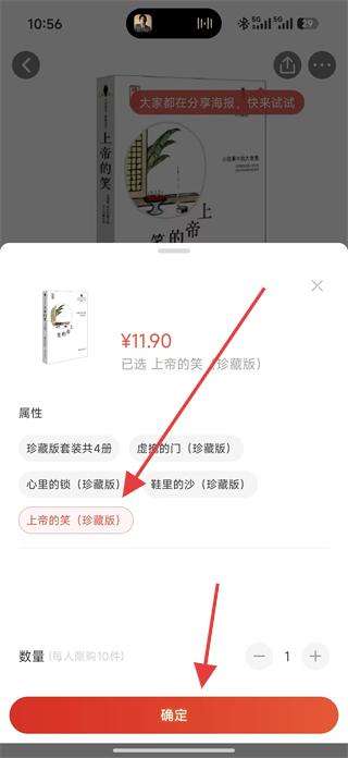 4、进入书籍详情页点击立即购买,选择书籍的属性如上帝的笑珍藏,确认购买数量后点击确定。