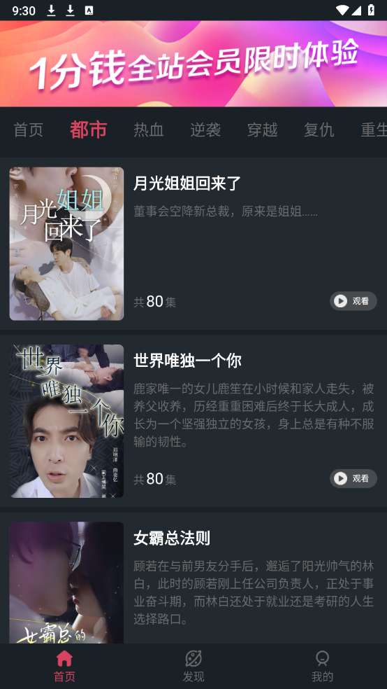 2、进入首页,有很多的短剧资源,包含了都市、逆袭、穿越或者复仇等类型。