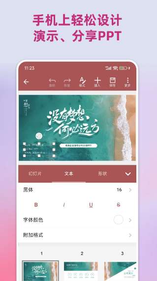 1、手机PPT制作:通过手机轻松创建PPT,支持幻灯片排版和图像布局优化,支持字体、颜色、背景等多种调整,使演示更加美观。