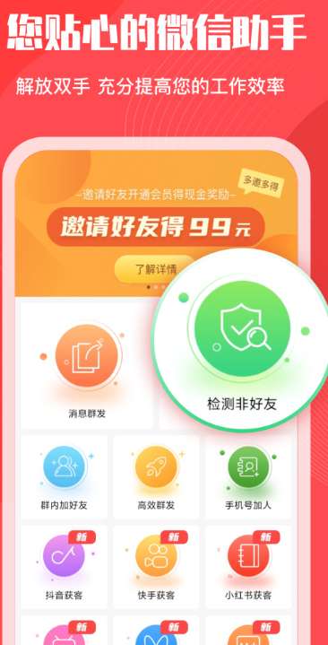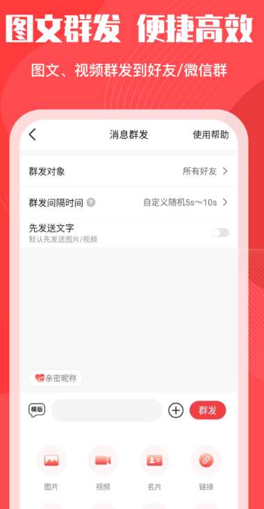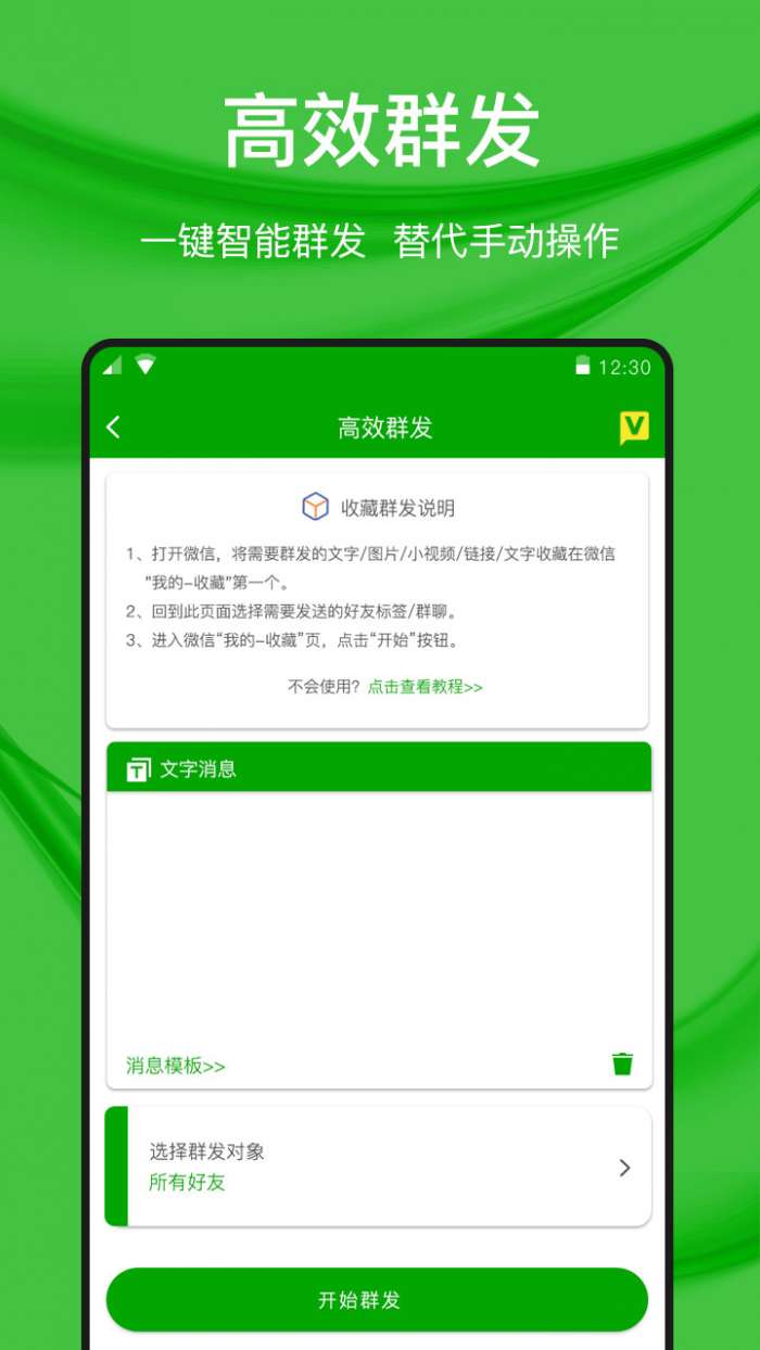 微好友管理app是一款全新的智能营销助手软件,专为微商设计。其目标是为微型企业提供一个高效的好友管理工具,提高用户粘性和转化率,同时降低运营成本和时间消耗。用户可以更好的管理自己的微信好友,适合拥有大量微信好友的用户,支持用户随时一键群发微信消息。多种实用功能可供选择和使用。独家群发主,可以帮助用户轻松发送自己的消息,并实时智能发送到群中,让用户轻松高效地发送消息。