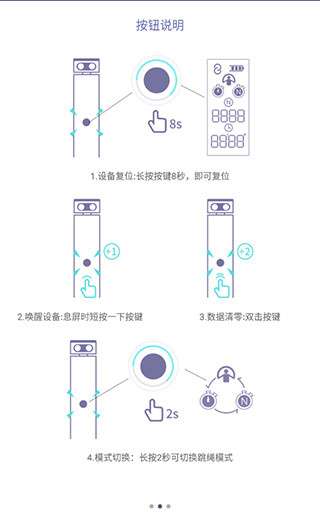 2、我们在还可以在按钮说明的页面中看到步骤【设备复位 长按按键8秒,即可复位】、【唤醒设备 息屏时短按一下按键】、【数据清零 双击按键】、【模式切换 长按2秒可切换跳绳模式】;