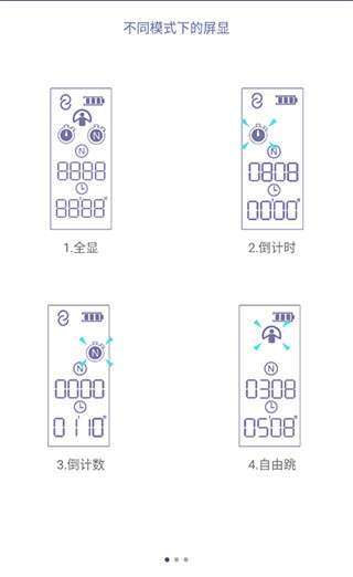 1. 开启满分跳绳软件,进入满分跳绳首页后,能看到不同模式下屏显呈现【全显、倒计时、倒计数、自由跳】等效果。