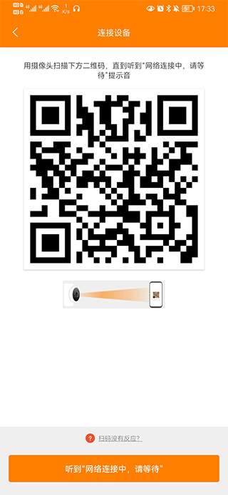 5、进入后,会呈现出一个二维码,将二维码放在摄像头下进行扫描,直到听到”网络连接中,请等待“提示音后并点击。