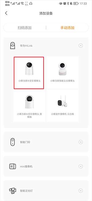 3、手动添加:在华为HiLink中点击小豚当家AI全彩摄像头。