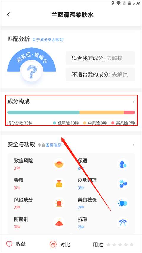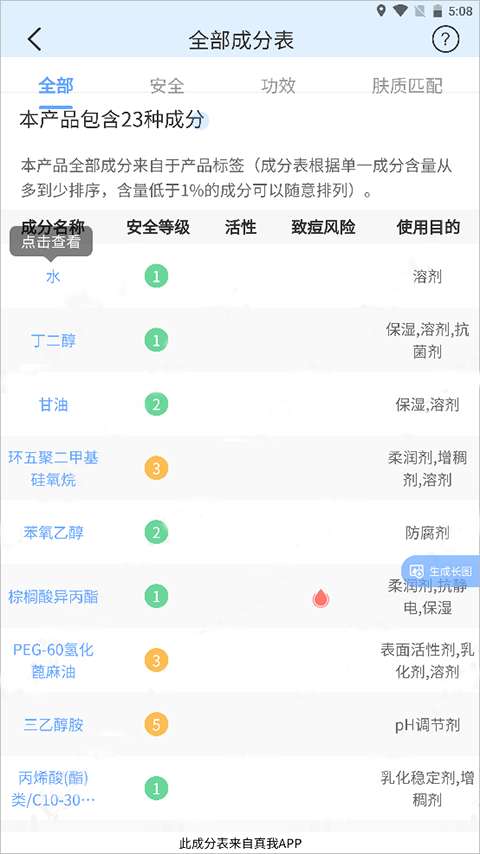 3、点击成分分析部分查看所有成分后,您将被重定向到一个详细的成分列表,在那里您可以看到护肤品的所有成分。