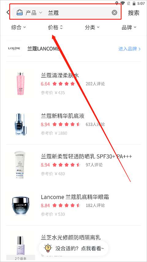 2、搜索后,将显示相关产品列表。点击产品进入产品详情页面,在当前页面找到成分分析栏。