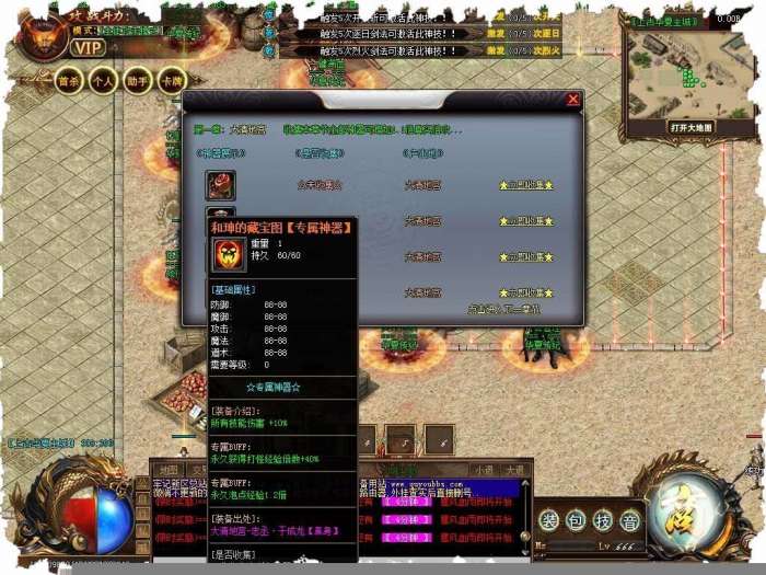 1.挑战新地图狐月山:大量出产星王首饰、王者装备、凤凰衣服、屠龙、嗜魂法杖、逍遥扇、开天、镇天、玄天、银星勋章、舒经活络丸、一二三级金针、绿宝石、书页、奇经培元丹凭证、天雷弹凭证、紧俏天赐。少量出产荣耀点凭证、火龙首饰、特戒藏宝图、特戒