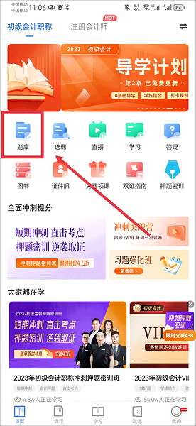 1、打开app,并在首页中点击题库。